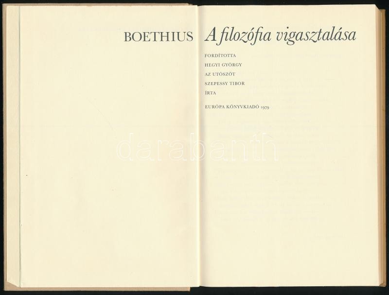 Boethius: A filozófia vigasztalása. Fordította: Hegyi György. Az utószót írta: Szepessy Tibor. Az Ókori Irodalom Kiskönyvtára sorozat. Bp.,1979, Európa. Kiadói kartonált papírkötés.
