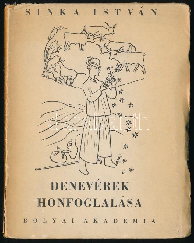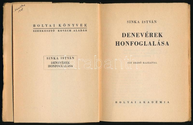Leírás: Sinka István: Denevérek honfoglalása. Bolyai Könyvek. Bp., 1941, Bolyai Akadémia (Pesti Lloyd-ny.) Első kiadás. Fáy Dezső rajzaival illusztrálva. Kiadói papírkötés, kissé sérült, illusztrált kiadói papírborítóban, helyenként kissé sérült lapszélekkel.