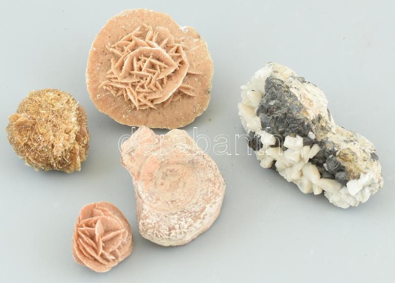 Leírás: 5 db ásvány (sivatagrózsája, amonites, kvarc, stb)
