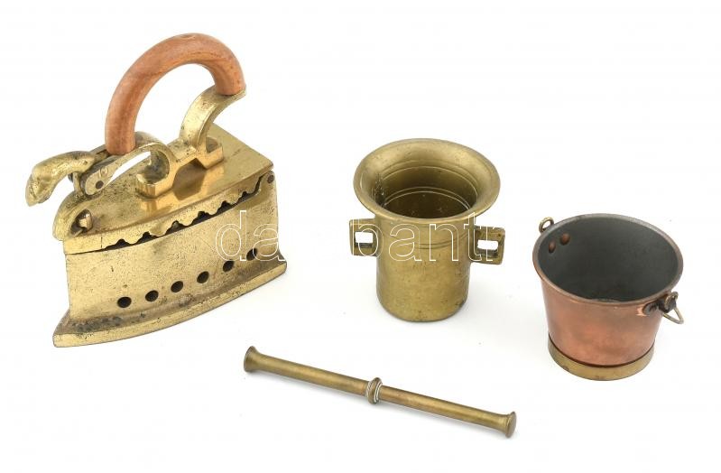 Leírás: Kicsinyített réz vasaló, vödör és mozsár, kopott, m: 4 és 11 cm között.