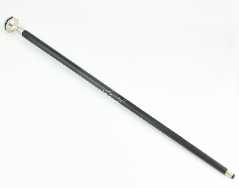 Leírás: Sétapálca, ébenfeketére pácolt fa pálca, gyöngyházberakásos fém nyéllel. Kopott, h: 90 cm