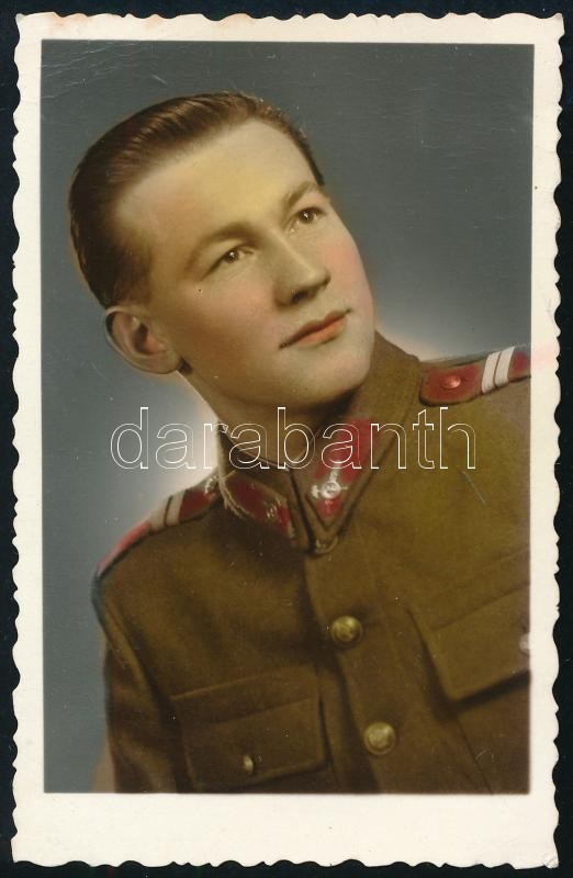 cca 1940 Katona színezett portréjáról készült fotómásolat, 8,5×5,5 cm https://www.darabanth.com/hu/408-Gyorsarveres/408.0/Mutargy-papirregiseg-egyeb/Militaria~28/cca-1940-Katona-szinezett-portrejarol-keszult-fotomasolat-8-5C3975-5-cm~II2527300