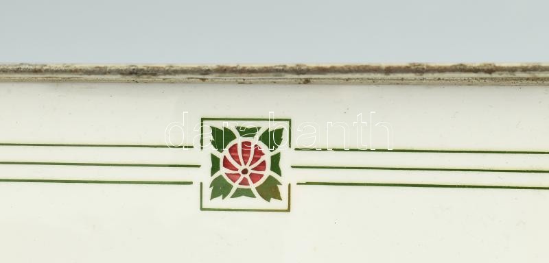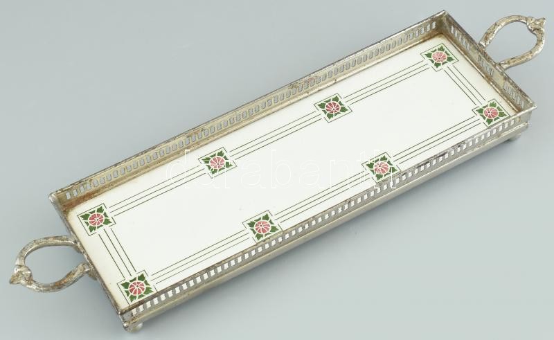 Leírás: Jugendstil fajanszbetétes fém, füles tálca, jelzett, kopott, 40x10,5cm