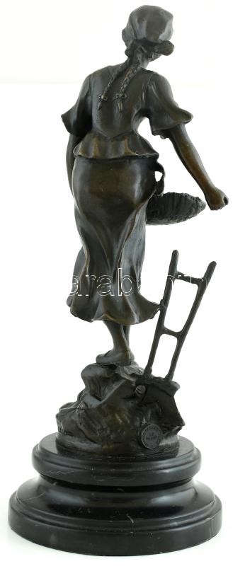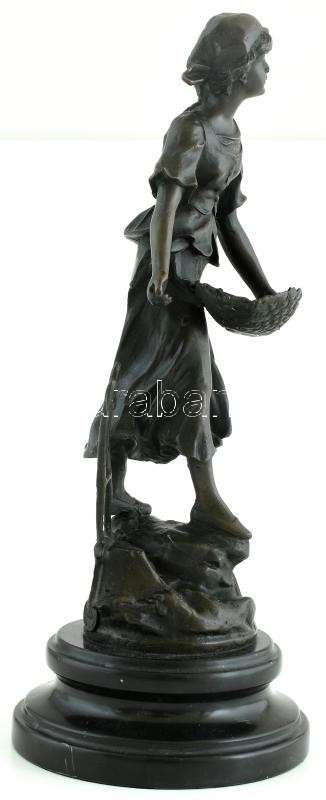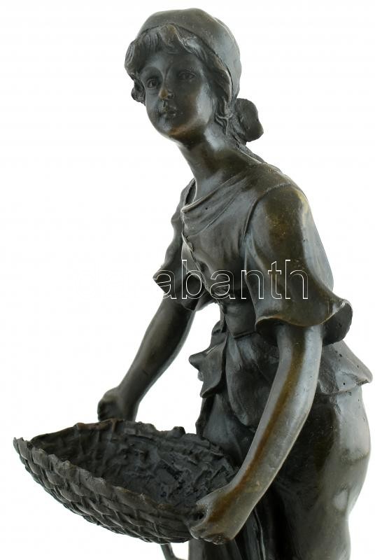 Leírás: C. Pesmeure jelzéssel: Magvető lány. Öntött, patinázott bronz, márvány talpon. m: 33,5 cm