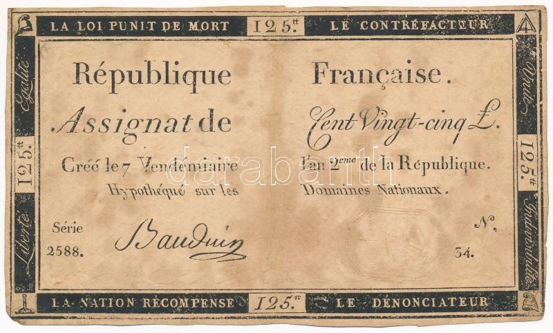 Franciaország 1793. 125L "Assignata" vízjeles papíron szárazpecséttel "2588" T:III- hátlapon ragasztónyom
