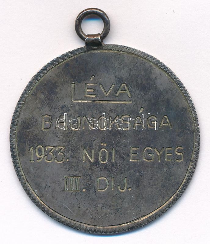 Leírás: 1933. Tenisz sport díjérem, hátoldalon gravírozva "LÉVA BAJNOKSÁGA 1933. NŐI EGYES III. DÍJ", füllel (38mm) T:1-,2