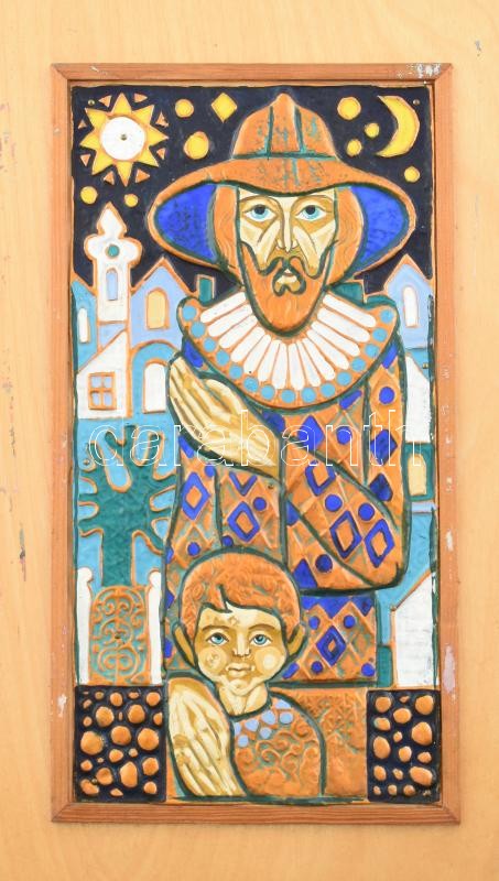 Jelzés nélkül: Apa fiával, 1960-70 körül. Zománcfesték, rézlemez. Fa keretben, hátoldalán Nemez és Rostfeldolgozó Háziipari Szövetkezet címkéjével.