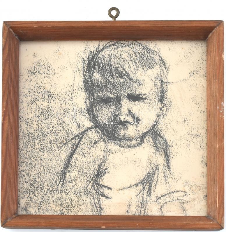 Leírás: Kreitz Károly (1935k.-?): Kisgyerek portréja. Szén, papír, jelzés nélkül. Üvegezett fa keretben, 15×15 cm