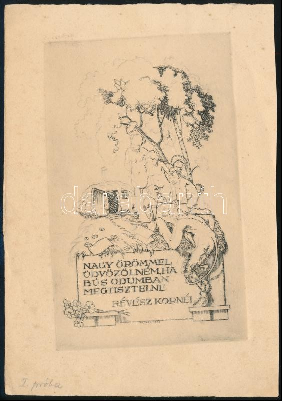 Révész Kornél (1885-1944): Nagy örömmel üdvözölném, ha bús odumban megtisztelne. Rézkarc, papír, jelzett a karcon, próbanyomat I. próba jelzéssel, kissé foltos, 16x10 cm