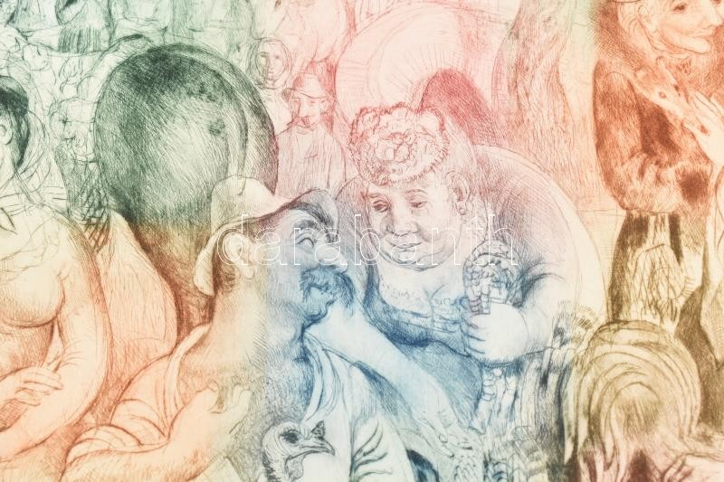 Leírás: Szabó Vladimír (1905-1991): Vásár. Színes rézkarc, papír, jelzett. Keretben, 29×39 cm