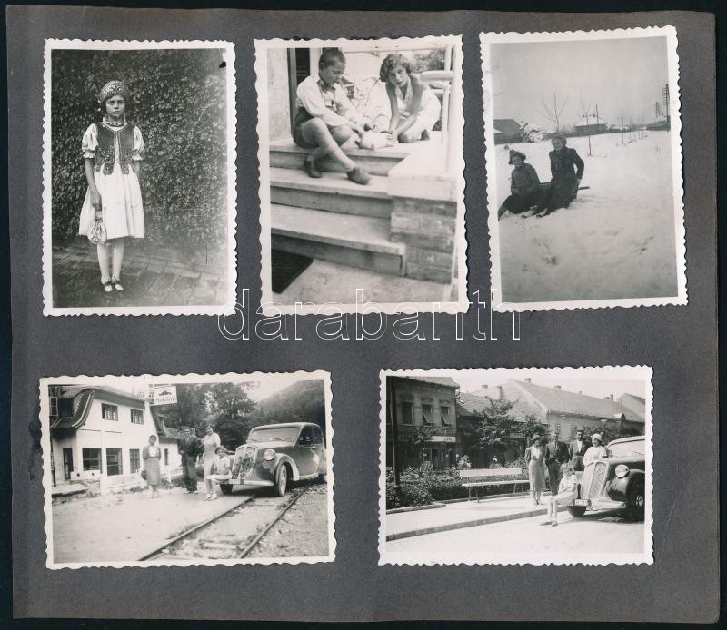 Leírás: 11 db vegyes témájú (autók, népviselet, Mobiloil reklámtábla, stb.) fotó albumlapra ragasztva, vegyes méretben