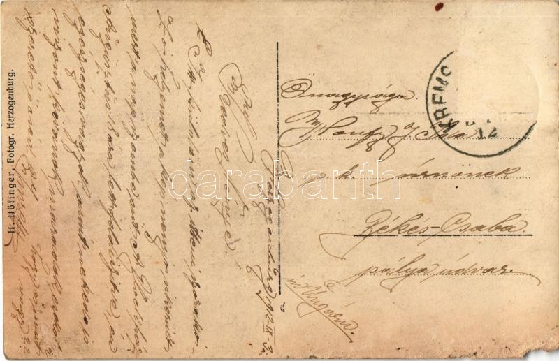 1912 Herzogenburg, "Hoch lebe Franz Josef I! Gott erhalte, Gott beschütze unsern Kaisern, unser Land" railway station with railwaymen and K.u.K. soldiers, building decorated with signs praising Franz Joseph I of Austria. H. Höfinger Fotogr. photo (b)