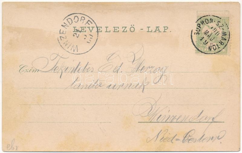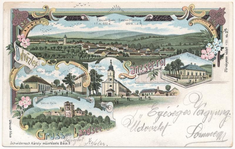 1900 Lánzsér, Lándzsér, Landsee (Sopronszentmárton); Plébánia, templom, iskola, várrom / Pfarrhof, Kirche, Schule, Schlossruine / rectory, church, school, castle ruins. Schwidernoch Károly Art Nouveau, floral, litho (fl)