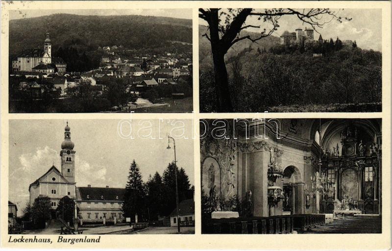 1937 Léka, Lockenhaus; látkép, templom, vár, templom belső. Franz Martin Kaufmann kiadása. Franz Mörtl felvétele / general view, church, castle, church interior