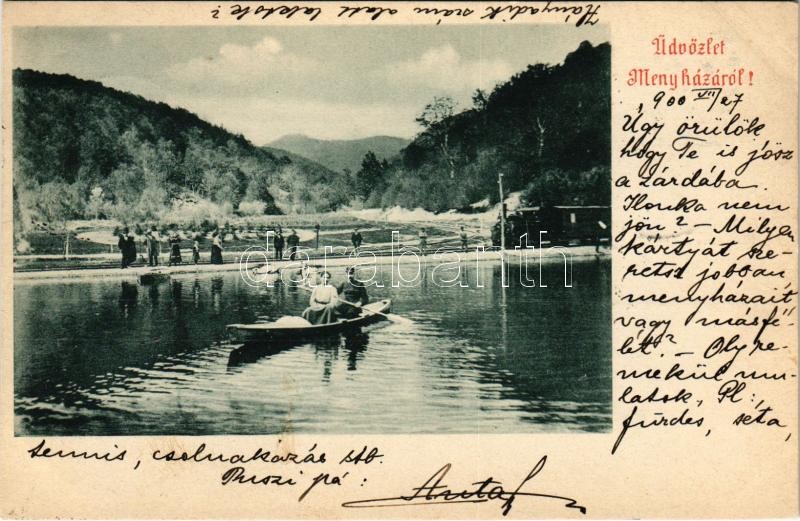 Leírás: 1900 Menyháza, Monyásza, Moneasa; csónakázás, gőzmozdony, vasút / locomotive, railway