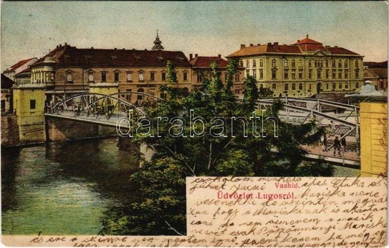 Leírás: 1907 Lugos, Lugoj; Vashíd, Sas gyógyszertár, üzletek. Nemes Kálmán kiadása / bridge, pharmacy, shops (vágott / cut)