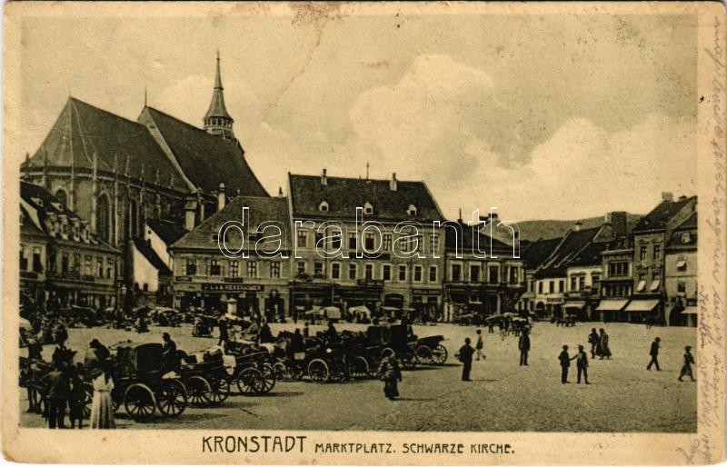 1915 Brassó, Kronstadt, Brasov; Marktplatz, Schwarze Kirche / Piactér, Fekete templom, J. L. & A. Hesshaimer üzlete. H. Zeidner kiadása / market, church, shops (fl)
