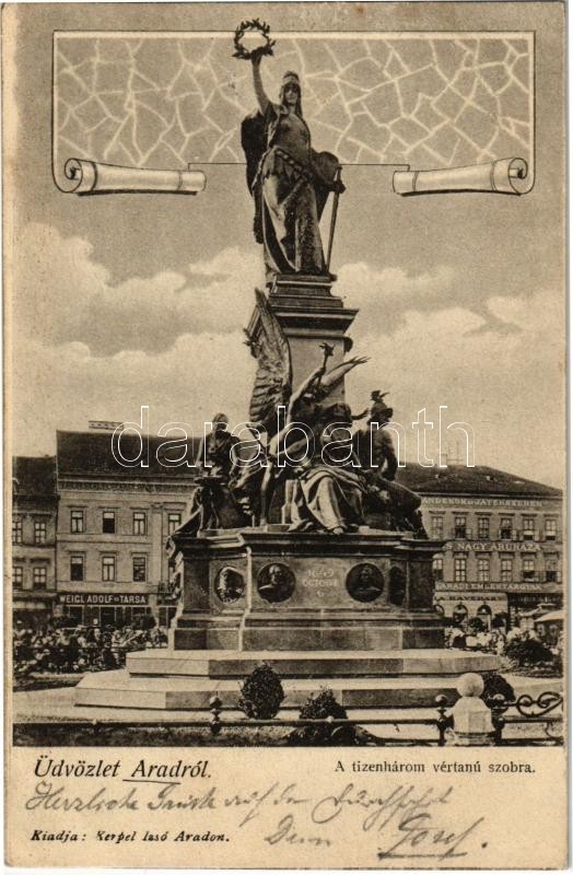 Arad, A tizenhárom vértanú szobor, Weigl Adolf és Társa üzlete, kávéhá... https://www.darabanth.com/hu/409-Gyorsarveres/409.0/Kepeslapok/Erdely~1000006/Arad-A-tizenharom-vertanu-szobor-Weigl-Adolf-es-Tarsa-uzlete-kavehaz-Kerpel-Izso-kiadC3~II2535383