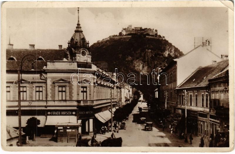 Leírás: Déva, Mária királyné utca, Orient szálloda, vár, Hirsch testvérek üzlete / Strada Regina Maria cu Cetatea / street view, hotel, shops, castle (EK)