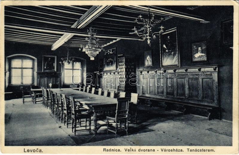 Lőcse, Levoca; Radnica, Velká dvorana / Városháza, tanácsterem, belső.... https://www.darabanth.com/hu/409-Gyorsarveres/409.0/Kepeslapok/Felvidek~1000007/Locse-Levoca-Radnica-Velka-dvorana-Varoshaza-tanacsterem-belso-Elek-Singer-kiadasa-~II2535089