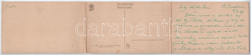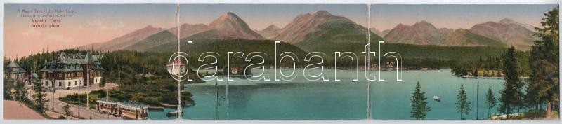 Leírás: Tátra, Magas-Tátra, Vysoké Tatry; Strbské pleso / Csorba-tó, villamos. Három részes kihajtható panorámalap / lake, tram. 3-tiled folding panoramacard