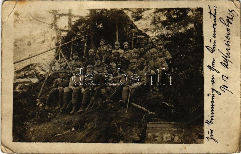 1918 Első világháborús osztrák-magyar katonák csoportképe álcázott fa állás előtt / WWI K.u.k. military camouflaged post with soldiers. photo + "K.u.k. 8 cm M 5/8. Feld. Batt. Tirol Nr. 38. Zensuriert" (EB)