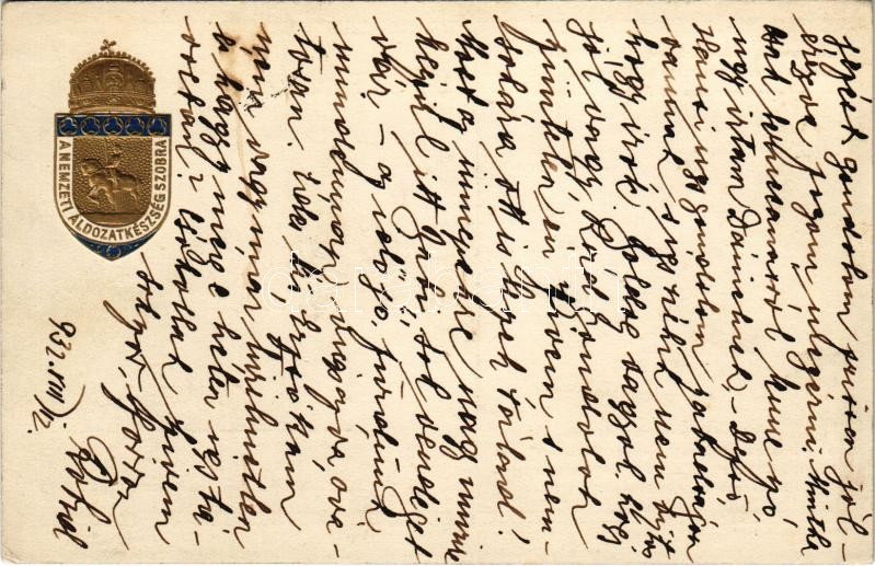 Leírás: 1932 Nemzeti Áldozatkészség Szobor segélylap / WWI Austro-Hungarian K.u.K. military charity fund, golden Emb. (EK)