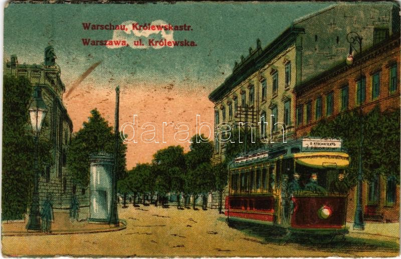 Leírás: 1916 Warszawa, Varsovie, Varsó, Warschau, Warsaw; Królewskastr. / Ul. Królewska / street view, tram (EK)