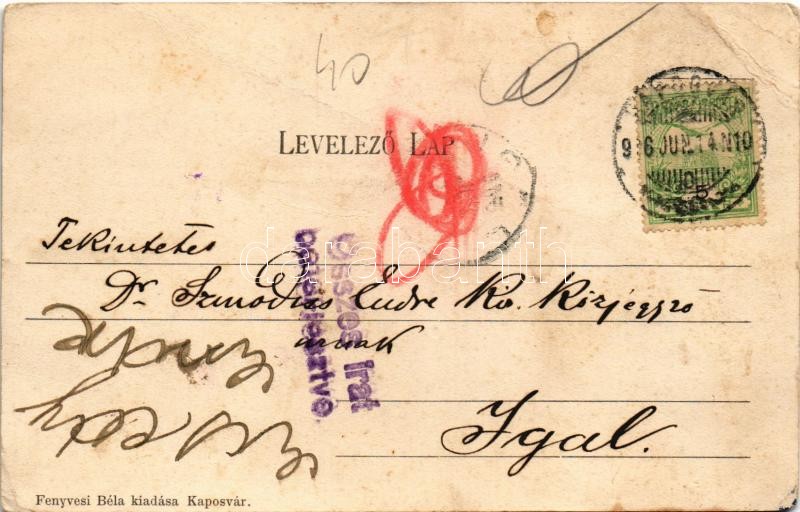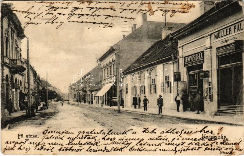 Leírás: 1906 Kaposvár, Fő utca, Müller Pál cipész, Fenyvesi Béla üzlete és saját kiadása (EB)