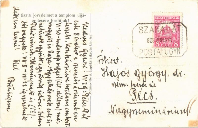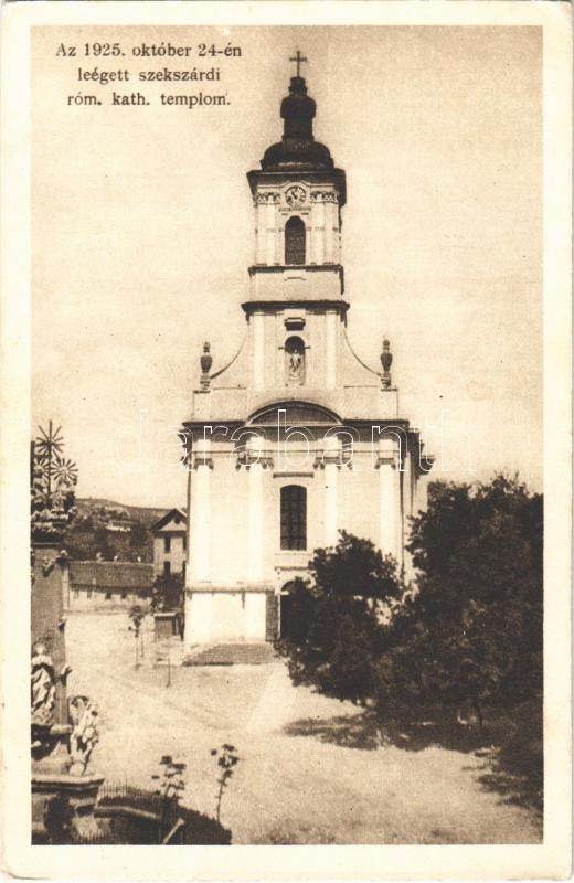 Leírás: 1928 Szekszárd, az 1925. október 24-én leégett római katolikus templom + "SZAKADÁT POSTAI ÜGYN." (EK)