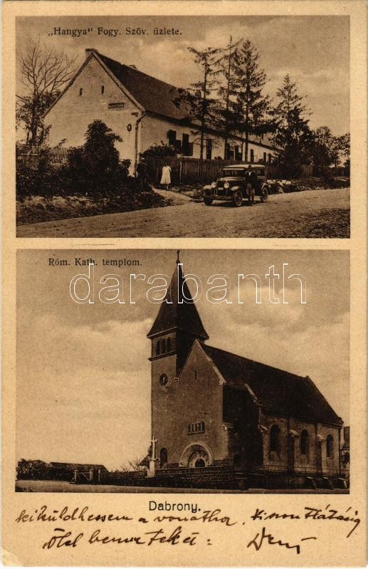1932 Dabrony (Devecser), Római katolikus templom, Hangya fogyasztási s... https://www.darabanth.com/hu/409-Gyorsarveres/409.0/Kepeslapok/Magyarorszag~1000005/1932-Dabrony-Devecser-Romai-katolikus-templom-Hangya-fogyasztasi-szovetkezet-uzlete-automob~II2538131