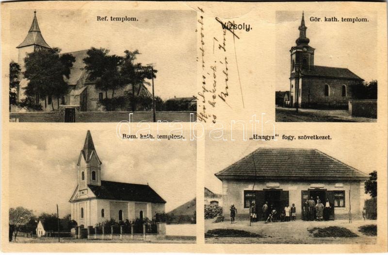 1933 Vizsoly, Református templom, Görögkatolikus templom, Római katolikus templom, Hangya szövetkezet üzlete. Szilágyi Arthur fényképész (vágott / cut)