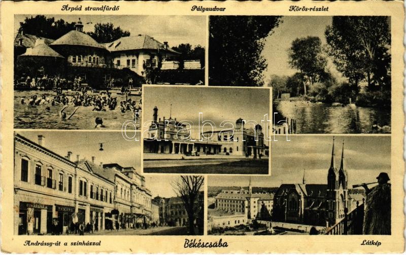 Leírás: 1942 Békéscsaba, Árpád strandfürdő, pályaudvar, vasútállomás, Körös részlet, Andrássy út, színház, cukrászda, Takáts üzlete