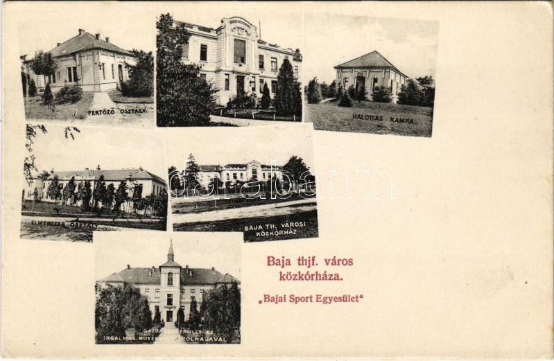 Leírás: Baja, Thjf. város közkórháza, Bajai Sport Egyesület, fertőző és elmebeteg osztály, halottas kamra, gazdasági épület és Irgalmas nővérek kápolnája