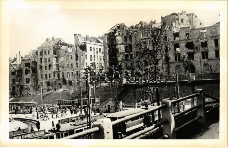 Leírás: Budapest II. Széll Kálmán tér a második világháborúban lebombázott épületekkel, villamosok. photo