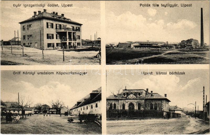 Leírás: Budapest IV. Újpest, Pollák féle textilgyár, Gyárigazgatósági épület, Városi bérházak, Gróf Károlyi uradalom (Káposztásmegyer)