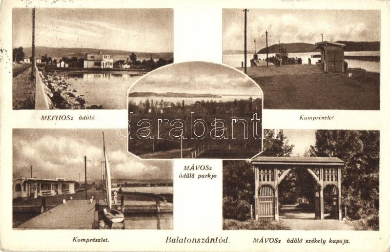 Leírás: Szántód, Balatonszántód; MEFHOSz (Magyar Egyetemi és Főiskolai Hallgatók Országos Szövetsége) üdülő, MÁVOSz (Magyar Vasutasok Országos Szövetsége) üdülő parkja, Komp, MÁVOSz üdülő székely kapuja (EK)