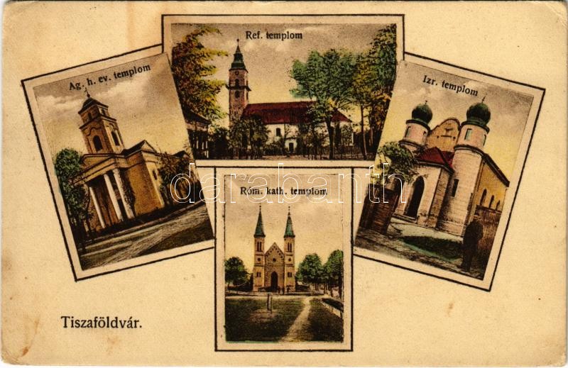 Leírás: Tiszaföldvár, református, római katolikus, izraelita és ágostai evangélikus templom, zsinagóga (EK)