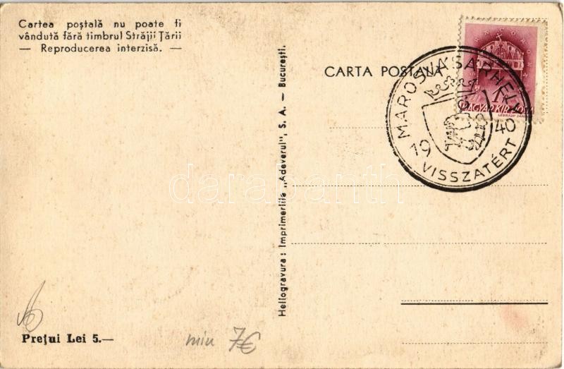 Viata si avutul vostru sta in puterea armatei inzestrand armata va faceti datoria catre voi si tara. Comandatul Strajii Tarii / Romániai katonai propaganda lap a Straja Tarii paramilitáris ifjúsági szervezet kiadásában / Romanian paramilitary youth organization propaganda card + "1940 Marosvásárhely visszatért" So. Stpl.