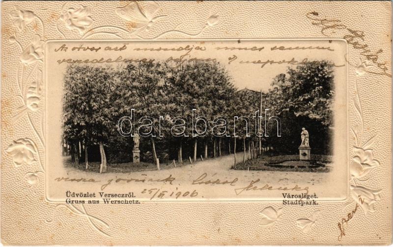 1906 Versec, Werschetz, Vrsac; Városliget. Szecessziós dombornyomott d... https://www.darabanth.com/hu/409-Gyorsarveres/409.0/Kepeslapok/Vajdasag~1000010/1906-Versec-Werschetz-Vrsac-Varosliget-Szecesszios-dombornyomott-diszites-Wilhelm-Wettl-No~II2540691