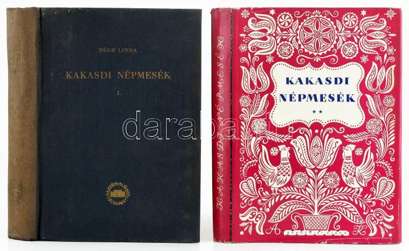Dégh Linda: Kakasdi népmesék I-II. köt. I. köt. Palkó Józsefné meséi. II. köt.: Palkó Józsefné, Andrásfalvi György, Sebestyén Lajosné, és László Márton meséi. Bevezető tanulmánnyal és jegyzetekkel kísérő Dégh Linda. Új Magyar Népköltési Gyűjtemény. VIII - IX. Bp., 1955-1960., Akadémiai Kiadó, 509;399+1 p. Kiadói aranyozott egészvászon-kötés, a II. kötet kiadói kissé szakadt papír védőborítóban, az I. kötet gerince fakó, kopott, egyébként jó állapotban. Megjelent 2200 és 900 példányban.