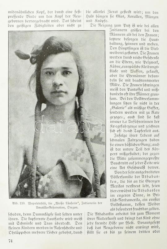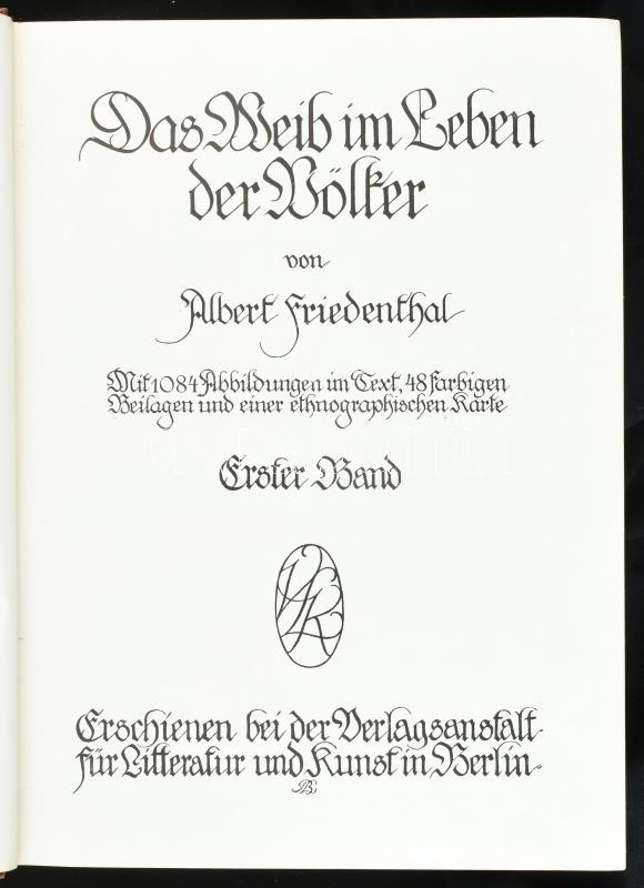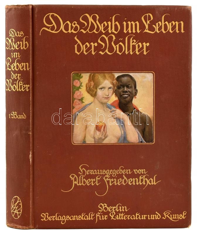 Friedenthal, Albert: Das Weib im Leben der Völker. Erster Band. Berlin, 1910, Verlagsanstalt für Litteratur und Kunst. Számos szövegközi és egészoldalas képpel illusztrálva, egy kihajtható táblával. Német nyelven. Kiadói aranyozott egészvászon-kötés, kissé sérült, kopott borítóval és gerinccel, néhány a kötéstől részben elvált, illetve kijáró lappal.