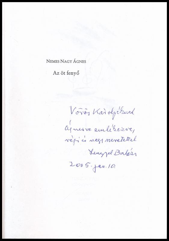 Az író, Nemes Nagy Ágnes (1922-1991) volt férje, Lengyel Balázs (1918-2007) író, kritikus által dedikált példány.