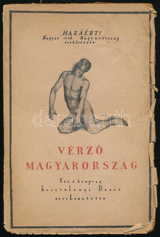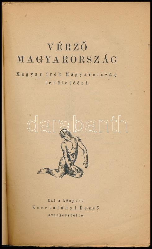 Vérző Magyarország. Magyar írók Magyarország területéért. Szerk.: Kosztolányi Dezső. Jeges Ernő illusztrációival. Budapest, é.n. [1920], Pallas, 236 p. Szövegközti és egészoldalas illusztrációkkal, valamint egy kihajtható térképpel illusztrálva. Kiadói illusztrált papírkötés, szakadozott, sérült borítóval.
