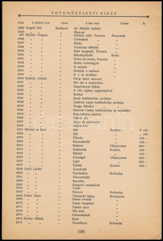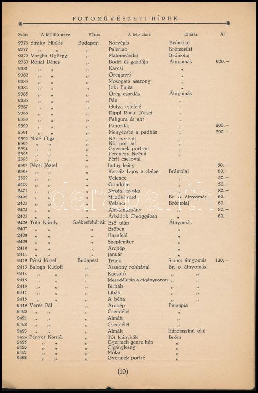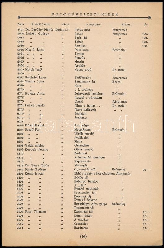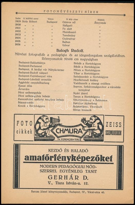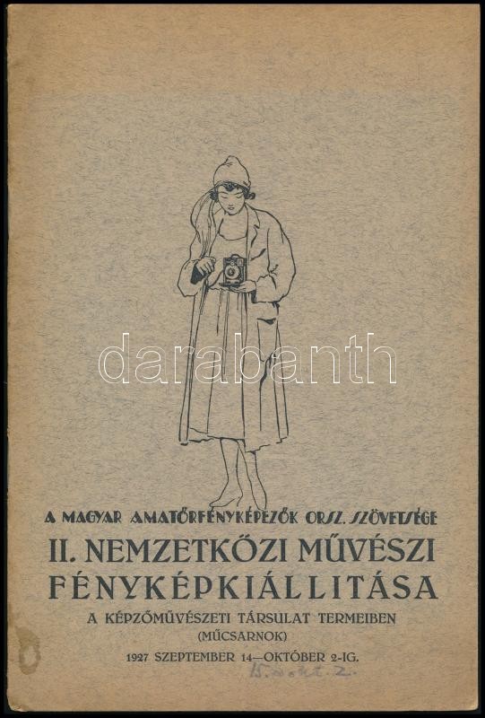 1927 Magyar Amatőrfényképezők Országos Szövetségének II. nemzetközi művészi fényképkiállítása. A képző művészeti társulat termeiben (műcsarnok) 1927. szept. - október 2-ig. Bp., 1927., Barcza József-ny., 19+1 p. Benne neves fotóművészekkel, Vadas Ernő, Szöllősy Kálmán, Kerny István, Dulovits Jenő, Angelo Pál, Székely Aladár. Kiadói papírkötés, a borítón kis folttal.