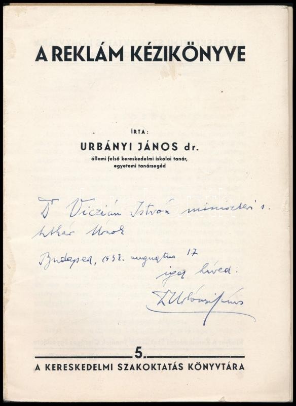 Urbányi János: A reklám kézikönyve. Kereskedelmi Szakoktatás Könyvtára 5. Bp., 1930., Kereskedelmi Szakiskolai Tanárok Országos Egyesülete, (Biró Miklós-ny.),184+8 p. Kiadói papírkötés, a gerincen kis sérüléssel, a borító elvált a könyvtesttől és a könyvtest szétvált, mellékletek nélkül, megviselt állapotban. A szerző, Urbányi János (1896-1955) által Viczián István (1874-1959) politikus, államtitkár, országgyűlési képviselő, Pest-Pilis-Solt-Kiskun vármegye főispánja részére dedikált példány.