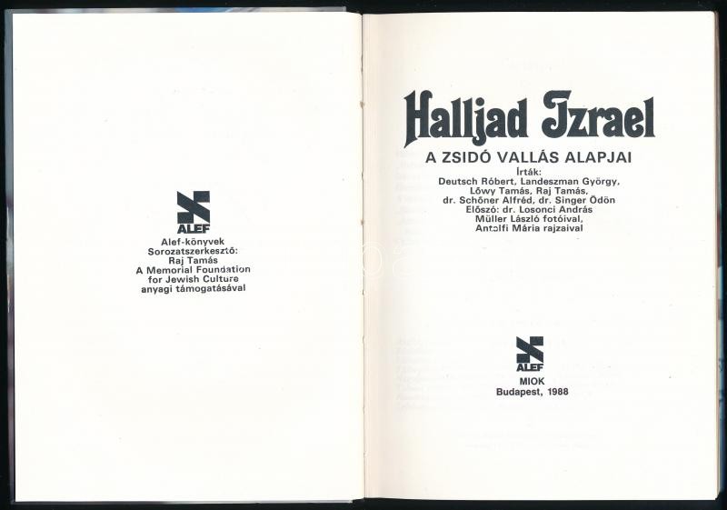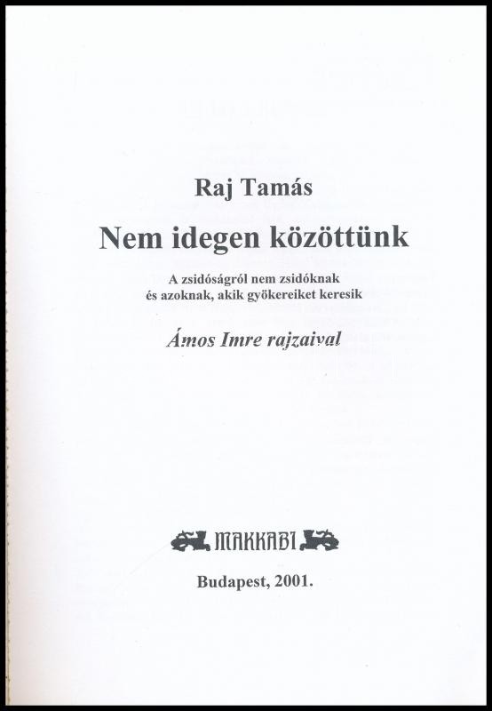 Raj Tamás: Nem idegen közöttünk. A zsidóságról nem zsidóknak és azoknak, akik gyökereiket keresik. Bp., 2001., Makkabi. Ámos Imre rajzaival. Kiadói papírkötés, jó állapotban. + Deutsch Róbert et al.: Halljad Izrael. A zsidó vallás alapjai. Alef-könyvek. Bp., 1988, MIOK. Kiadói kartonált papírkötés, jó állapotban.