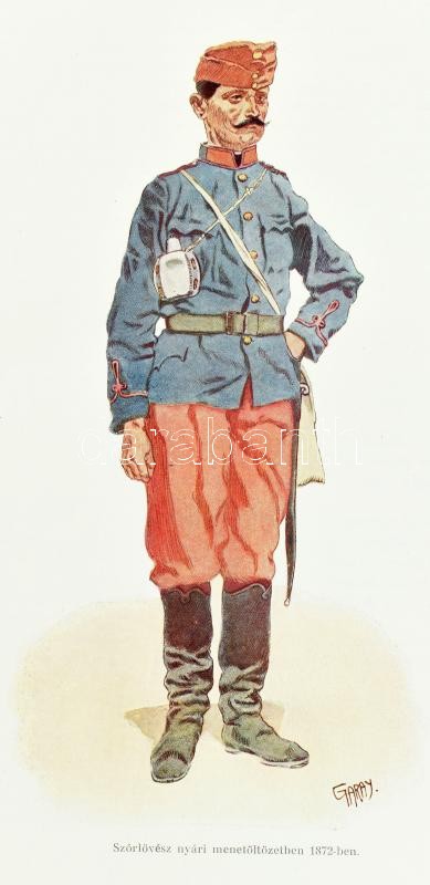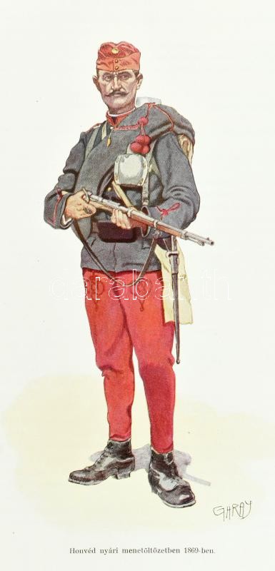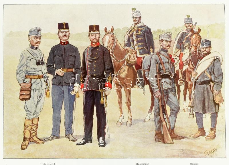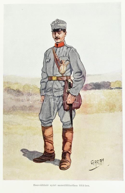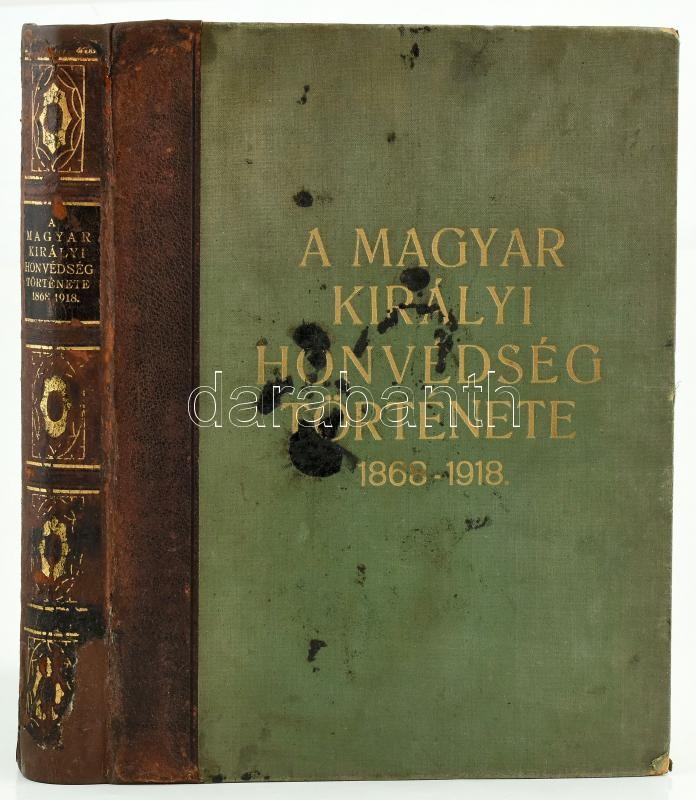 A magyar királyi honvédség története. 1868-1918. Írta: Suhay Imre tábornok vezetése alatt a M. Kir. Hadtörténelmi levéltár részéről kirendelt bizottság. Szerk.: Berkó István. Garay Ákos festőművész rajzaival. Bp.,1928, M. Kir. Hadtörténelmi Levéltár, 601 p. +11 (színes.) t. Első kiadás. Szövegközti és egészoldalas illusztrációkkal. Kiadói aranyozott félbőr-kötésben, kopott, foltos borítóval, kopott, javított, részben pótolt gerinccel, de belül hiánytalan és jó állapotú!
