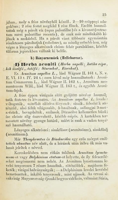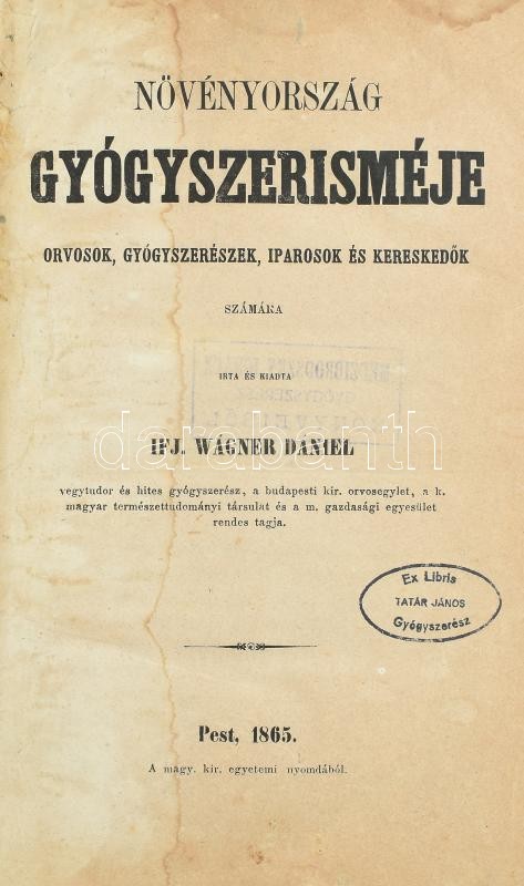 Ifj. Wágner Dániel: Növényország gyógyszerisméje orvosok, gyógyszerészek, iparosok és kereskedők számára írta és kiadja. Pest, 1865, M. Kir. Egyetemi Nyomda, 6+433+1 p. Átkötött félvászon-kötés, kopott borítóval, foltos lapokkal, a címlapon kis szakadással. 'Tatár János' és 'Medzibrodszky Ignácz' gyógyszerészek ex libris bélyegzéseivel.