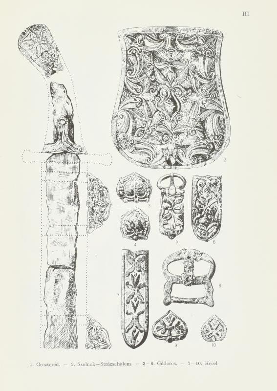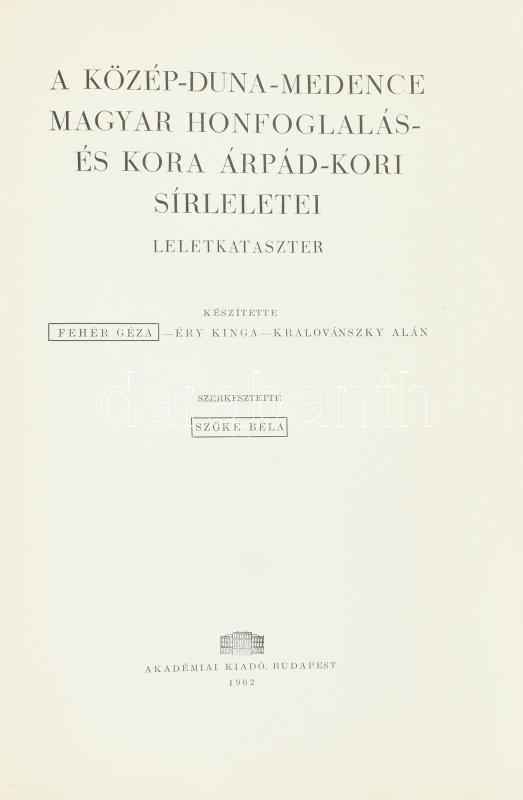 Régészeti tanulmányok I-II. köt. Szerk.: Gerevich László. I. köt.: Szőke Béla: A Honfoglaló és kora Árpád-kori magyarság régészeti emlékei. II. köt. Fehér Géza-Éry Kinga-Kralovánszky Alán: A Közép-Duna-medence magyar honfoglalás- és kora Árpád-kori sírleletei. Leletkataszter. Szerk.: Szőke Béla. Bp. 1962, Akadémiai Kiadó, 118+2 p.+XV t.; 99 p.+ 2 (nagyméretű kihajtható térkép-mellékletek, 42x59 cmx2.) Kiadói egészvászon-kötés, kiadói papír védőborítóban, az II. kötet papír védőborítóján folttal, kis szakadással. A II. kötetben Dienes István (1929-1995) régész, muzeológus jegyzeteivel számos jegyzetlapon.